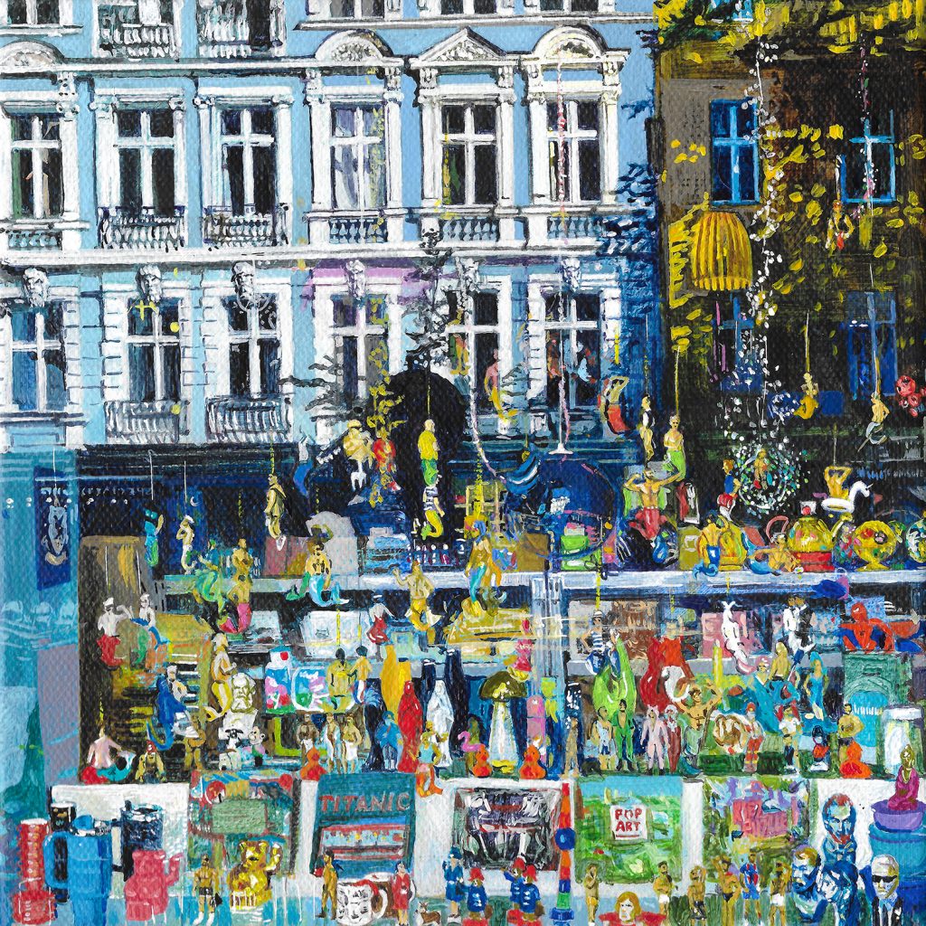 At the moment I am painting building sites or more specifically the image that I see when a curtain hides the work in progress of a building site. I like the complexity of the angles and lines, shapes and colours. I also like the temporary nature of the hoarding/curtain. That it is hiding something and all will be revealed in time. Everything is a ‘work in progress’ and it is this ‘progress’ that I am drawn to.